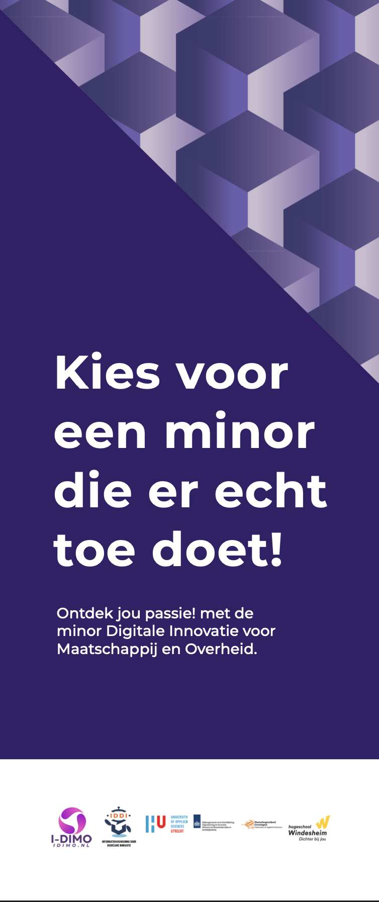 Idimo is een minorprogramma genaamd Digitale Innovatie voor Maatschappij en Overheid, waarbij studenten samenwerken met overheidsorganisaties om innovatieve oplossingen te ontwikkelen voor maatschappelijke uitdagingen. Binnen dit project heb ik de volledige merkidentiteit en branding van Idimo ontwikkeld. Mijn doel was om een identiteit te creëren die aansluit bij de visie van de minor, maar ook rekening houdt met stakeholders zoals overheidsinstanties, hogescholen en studenten. Studenten spelen hierin een belangrijke rol, omdat zij uiteindelijk de minor moeten volgen.